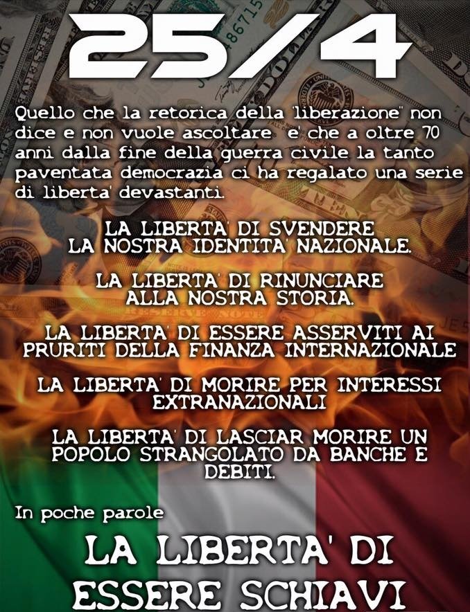 Mentre si celebra la “Liberazione”, che poi in realtà fu colonizzazione per la quale tanti pagarono un prezzo troppo alto, in Italia c’è chi non ha voglia di liberare alcunché. Napoli si liberò dal nazifascismo combattendo tra il 27 settembre e il 30 set. del 1943. Per scoprire poi che i liberatori non erano migliori di quelli dai quali ci eravamo liberati. Ricordando che resistenza e autodeterminazione dei popoli è molto meglio che essere liberati e colonizzati e che le/gli individui resistenti, giusto quando resistono, vengono sempre additati come criminali e terroristi.