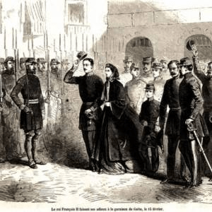 “Solo. A prendere decisioni che avrebbero dovuto salvare il trono dove nel 1734 si era seduto, per primo, il suo avo Carlo III. Solo, a 24 anni, a tentare di salvare il regno e il futuro della dinastia“. Solo, ma non del tutto. Aveva accanto la moglie, Maria Sofia di Baviera, sorella della leggendaria Principessa Sissi. Il 5 settembre il Re incaricò il Primo Ministro di scrivere l’annuncio della partenza per Gaeta, poi andò in girò per Napoli con la Regina, su una carrozza scoperta, con al seguito un paio di gentiluomini. La solita passeggiata quotidiana, come se l’avanzata di quel Generale col poncho– che Re Francesco chiamava familiarmente “il nostro Don Peppino” – non avesse tolto ai Sovrani neanche un quarto d’ora di serenità, come se nulla li potesse privare del dominio di sé, neanche la più pietosa delle scene, proprio sotto i loro occhi.