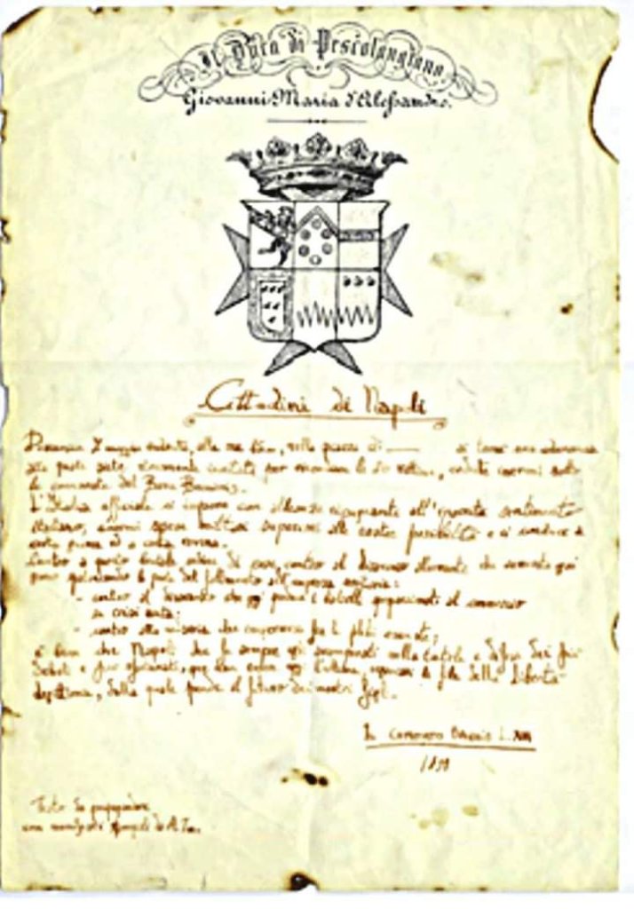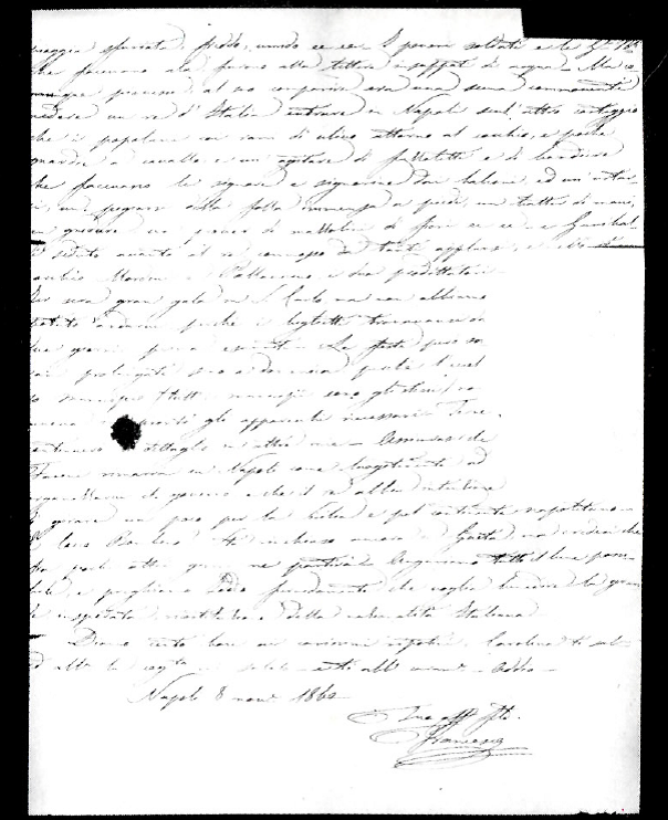 che voglia benedire la grande, insperata, ricostruzione della nazionalità italiana”. (Lettera scritta a Napoli l’8 novembre 1860, spedita il 10 e giunta a Cittanuova – Palmi – il 14)