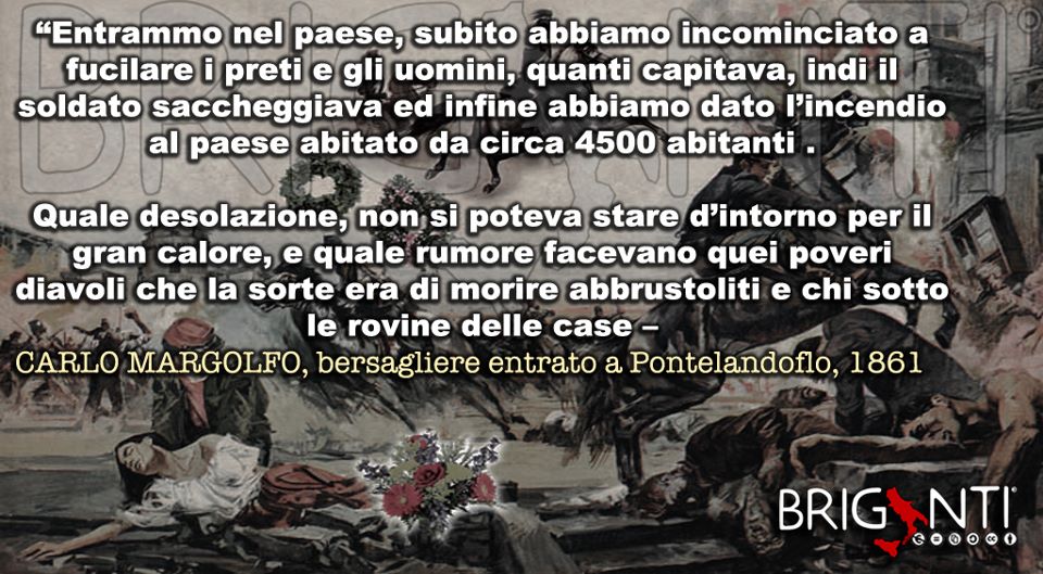“E’ possibile, come il governo vuol far credere, che 1.500 uomini comandati da due o tre vagabondi possano tenere testa a un intero Regno, sorretto da un esercito di 120.000 regolari? Perché questi 1.500 devono essere semidei, eroi! Ho visto una città di 5.000 abitanti [Pontelandolfo] completamente distrutta. Da chi? Non dai briganti”. (Deputato Giuseppe Ferrari)
