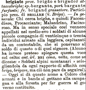 Brigante è una parola medioevale, che al principio indica un soldato a piedi, un fante di ventura. Entra nel linguaggio comune col vocabolo francese brigand, usato per identificare chi si oppone con le armi all’ordine stabilito dalla Rivoluzione, chi difende l’ancien régime, e perciò anche chi combatte per i Borbone spodestati da Napoleone.