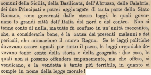 “Posso assicurare alla Camera che specialmente in alcune province, quasi non vi è famiglia, la quale non tremi dell’onnipotenza dell’autorità di polizia, dei suoi errori ed abusi. Sotto la fallace apparenza della persecuzione del brigantaggio si vuole avere in mano la facoltà di arrestare o mandare al domicilio coatto ogni specie di persone al Governo sospette”. (Deputato Pasquale Stanislao Mancini)