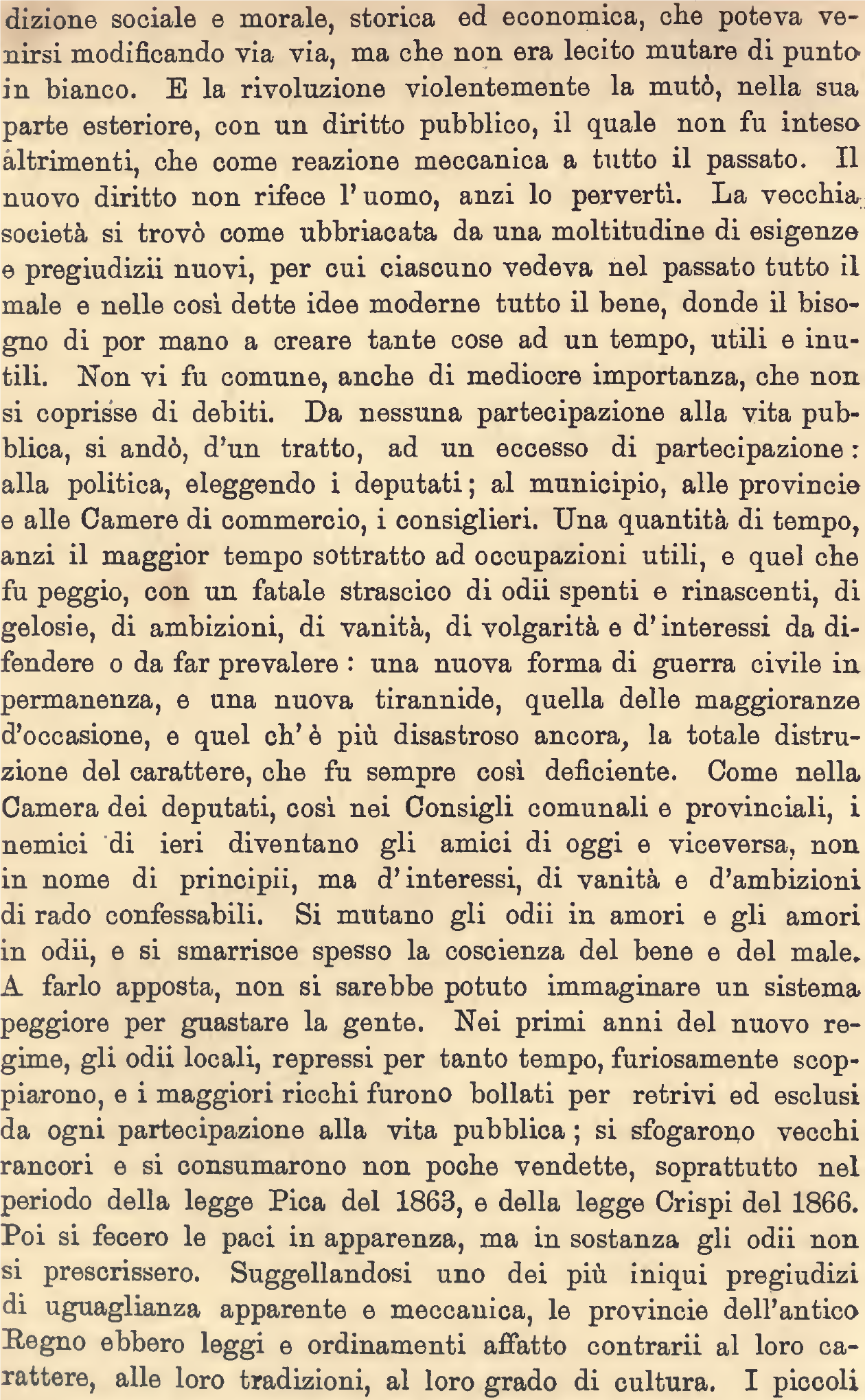 Le “Legge Pica”, orrenda in sé, diventò persino atroce, per la crudeltà con con cui fu applicata. Conteneva in nuce la teoria per cui le cose si possono fare, ma non si devono dire, che può esistere una giustizia priva di legalità. Sdoganava il fascino della scorciatoia, l’attitudine a formulare disposizioni ambigue, da applicare con ordini appena sussurrati. Introduceva un inquietante duplice livello di legittimità e verità nel cuore dello Stato. Inaugurava una serie di stagioni politiche scellerate, che si ripresenteranno in ogni fase di emergenza della storia nazionale.