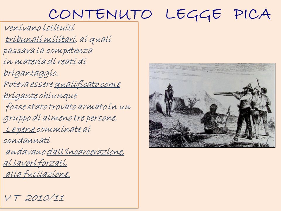 Nell’agosto del 1863 la Camera approvò la cosiddetta “Legge Pica”, un insieme di misure eccezionali, manifestamente incostituzionali, ma necessarie per riportare dentro una cornice di legalità formale gli abusi di soldati e politici, una via per istituzionalizzare quel potere militare che controllava il Meridione da almeno un anno. Tribunali militari, collegi di difesa pro-forma, condanne inappellabili, prerogative della magistratura azzerate, sovrapposizione tra organi di polizia e organi giudiziari, tutto per contrastare un reato di brigantaggio volutamente lasciato generico. Strumenti abberranti per una società civile, non solo secondo i valori odierni, ma anche in base ai parametri di allora. Disposizioni temporanee, nelle intenzioni, e poi prorogate sino a tutto il 1865.