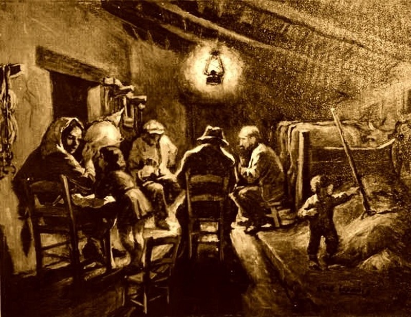 “Sono due casupole annerite dal tempo e più ancora dal fumo. Una serve da fienile e da stalla per le bestie, nell’altra dormiamo noi. Vedi quel misero letto sostenuto da asticelle fradice? Là dormono mia madre e mio padre. Nell’altro lettuccio vicino dormiamo noi tre fratellini tutti in fascio come tre stoccafissi. Vedi quel grosso canestro? Là dorme la sorella piccina. E nelle culla di vimini dorme l’ultimo nato, Marco, di pochi mesi. Eccoti mia madre che si strugge a cardar lana. Osserva com’è tutta unta e bisunta d’olio”.
