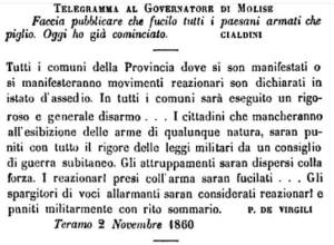 “Ammetto che nella repressione al brigantaggio un Generale possa talvolta procedere con misure energiche che oltrepassino gli stretti confini della legalità seguita scrupolosamente in tempi normali, ma è bene usare in ciò molta riservatezza astenendosi da pubblicità”. (Ministro della Guerra del Regno di Italia)