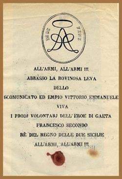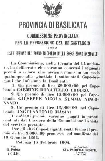 Già nel novembre del 1860 – pochi giorni dopo l’incontro di Teano tra Vittorio Emanuele e Garibaldi – un inquietante proclama compariva sui muri dei paesi intorno ad Avezzano, a firma del Generale Pinelli: “… chiunque sarà colto con arma da fuoco, coltello, stili od altra arma qualunque da taglio o punta e non potrà giustificare di essere autorizzato dalle autorità costituite sarà fucilato immediatamente … chiunque verrà riconosciuto di aver con parole o con denari o con altri mezzi eccitato i villici a insorgere sarà fucilato immediatamente … eguale pena sarà applicata a coloro che con parole od atti insultassero lo stemma dei Savoia, il ritratto del Re o la bandiera italiana … Deponete le armi, rientrate tranquilli nei vostri focolari, senza di che state certi che tardo o tosto sarete distrutti“.